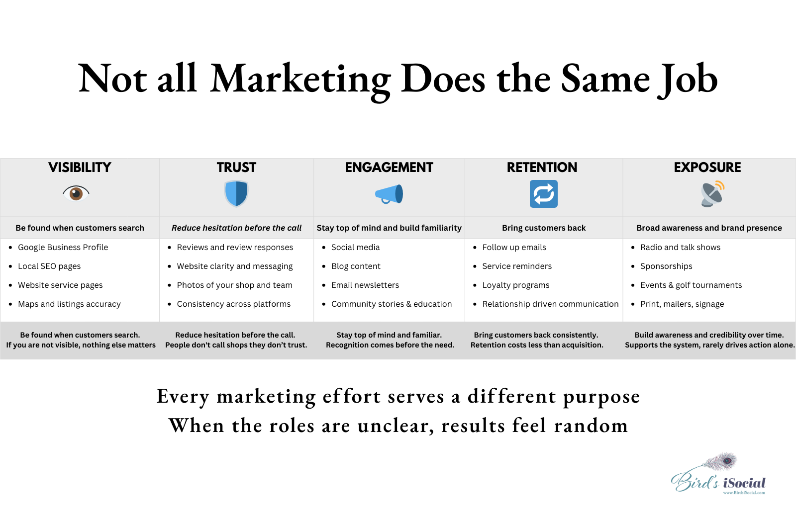 A big part of that frustration comes from expecting every piece of marketing to do the same job. It does not. Every marketing effort serves a different purpose. When those roles are clear, results make sense. When they are not, everything feels inconsistent and disappointing.